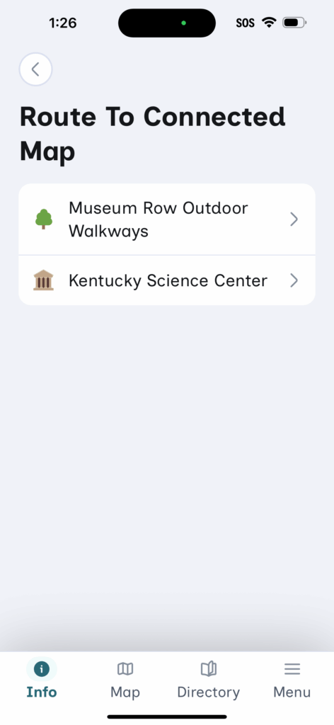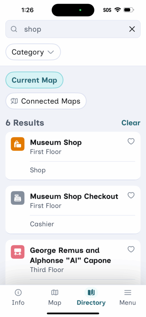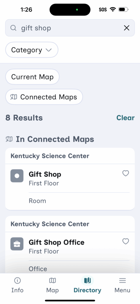 When you check in to the map and open the Directory, you’ll see a new filter – Current Map or Connected Map – when you start searching for a destination.
